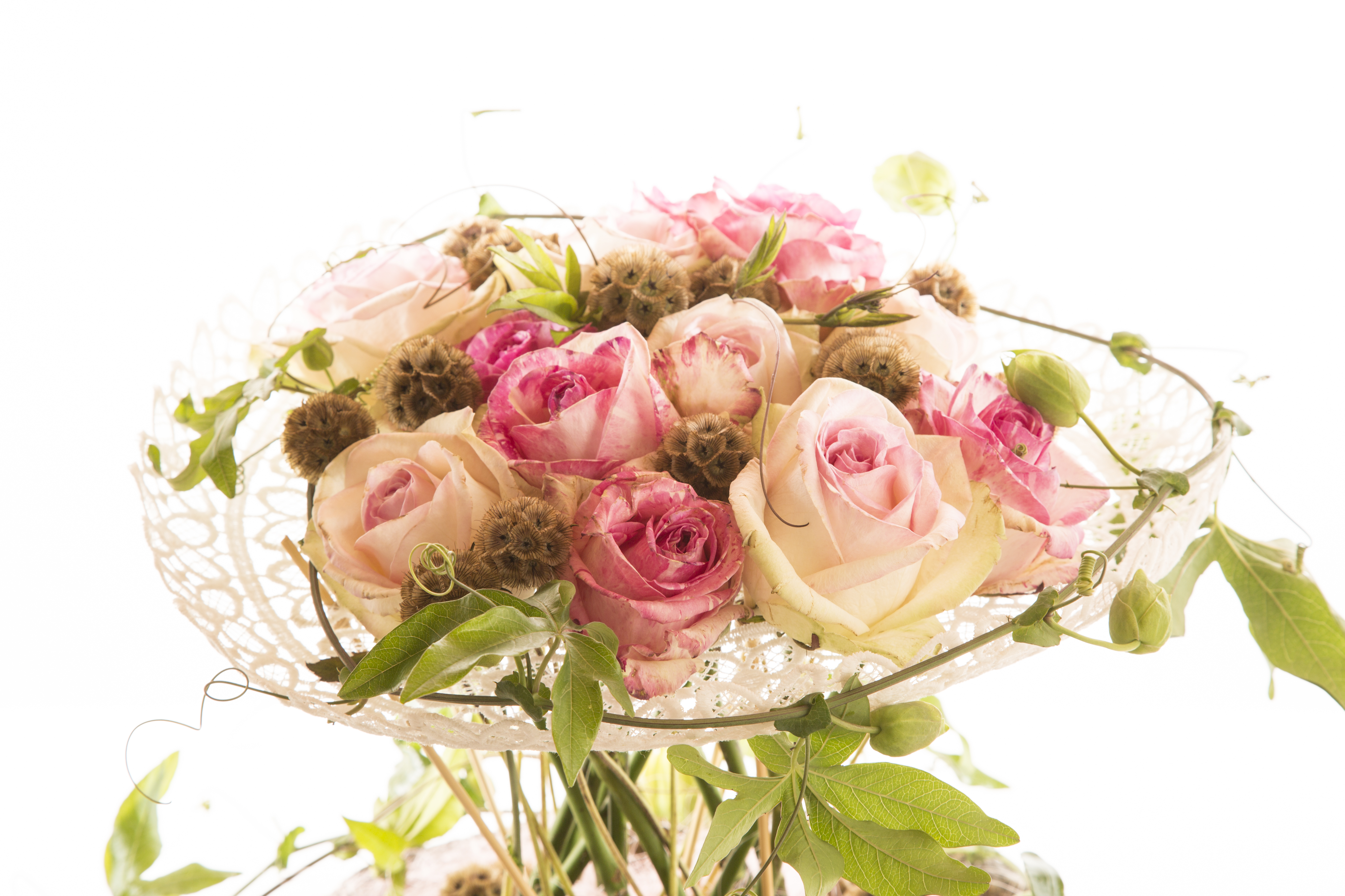 Gecombineerd met kant en Passiflora krijgen deze Freaky Avalanche+® en Dolce Avalanche+® rozen een super romantische uitstraling. Nelleke Bontje laat zien hoe je dit lieflijke bloemwerk maakt.