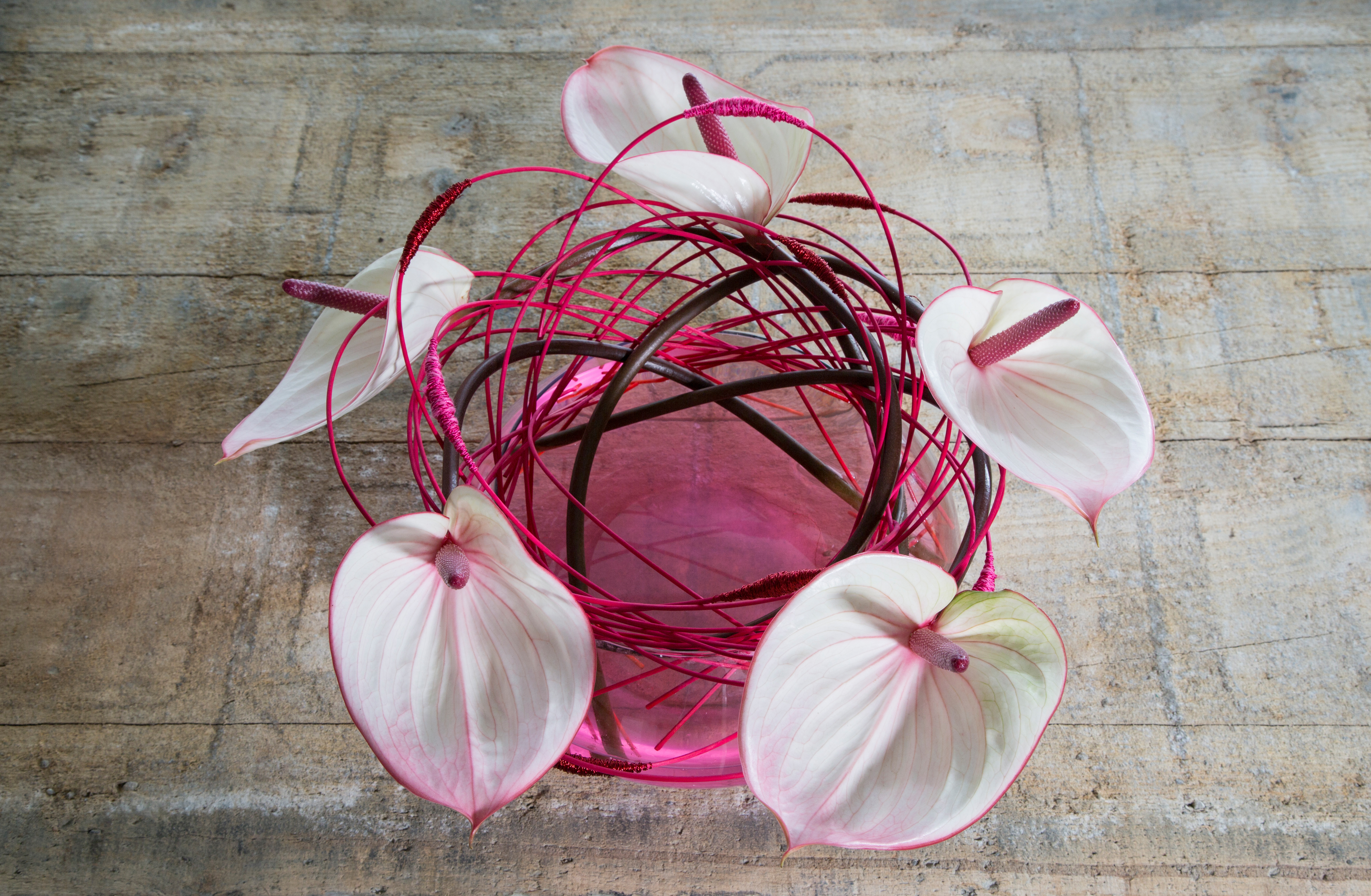 Idee voor een simpel boeket met Anthuriums van Kristel van Dijk: deze variëteit heet 'Facetto' en heeft een mooi vleugje roze. Deze kleur komt terug in het pitriet en het gekleurde water. Het pitriet zorgt voor een extra dimensie en beweging en de details met het gekleurde binddraad maken het geheel af.
