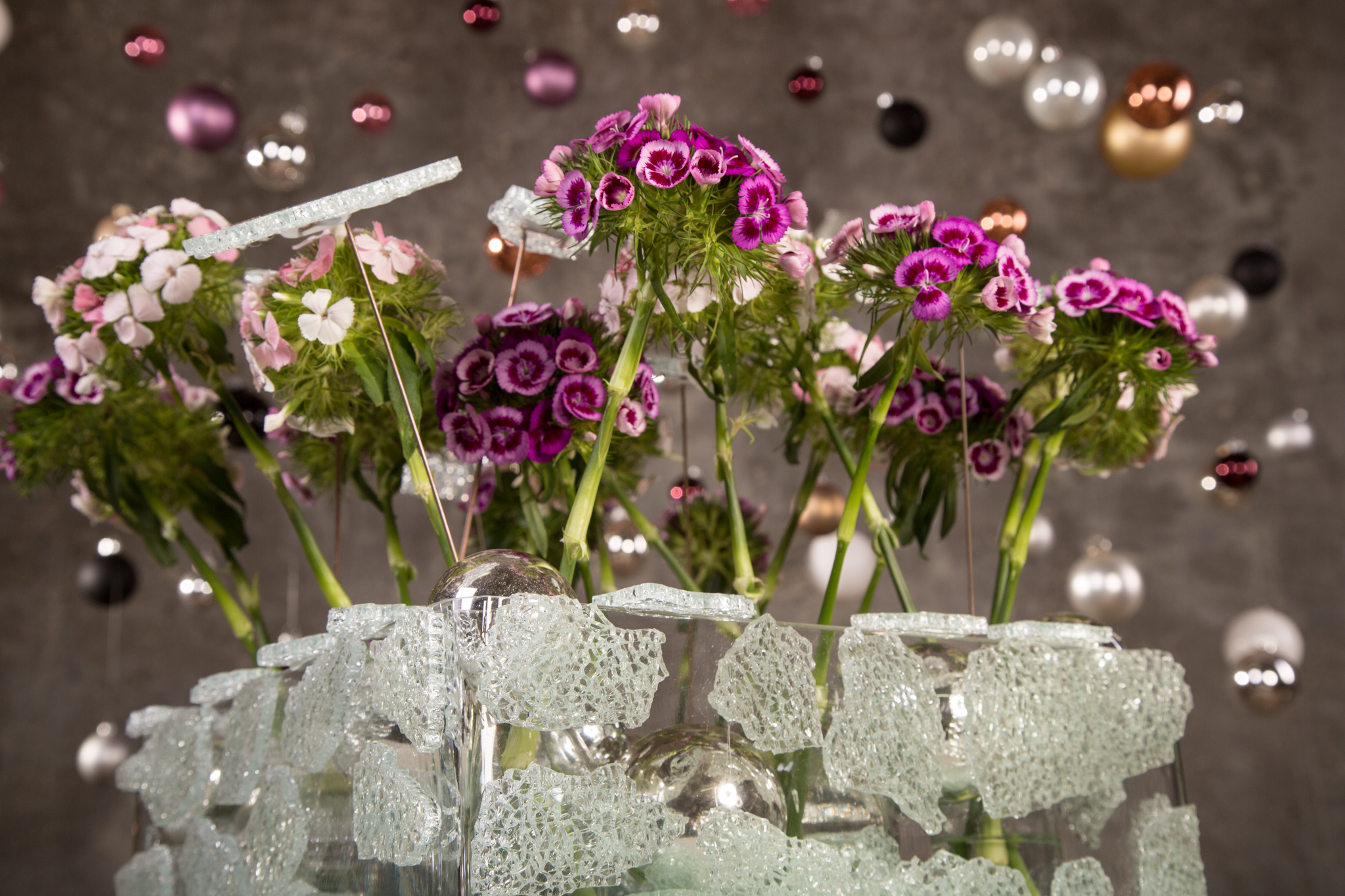 Voeg wat sprankel toe aan je kerststuk; gebruik deze prachtige paarse en roze Sparkz Breanthus® varieteiten 'Elmo' en 'Earl' voor een origineel kerstbloemwerk! In dit arrangement brengt Pim van den Akker recycling naar een hoger niveau door stukken gebroken veiligheidsglas als detail te gebruiken. Hij lijmt stukken op de glazen schaal en plaatst ze tussen de bloemen. De structuur van deze stukjes glas heeft wel een gaaf effect, vind je niet? Durf te experimenteren!
