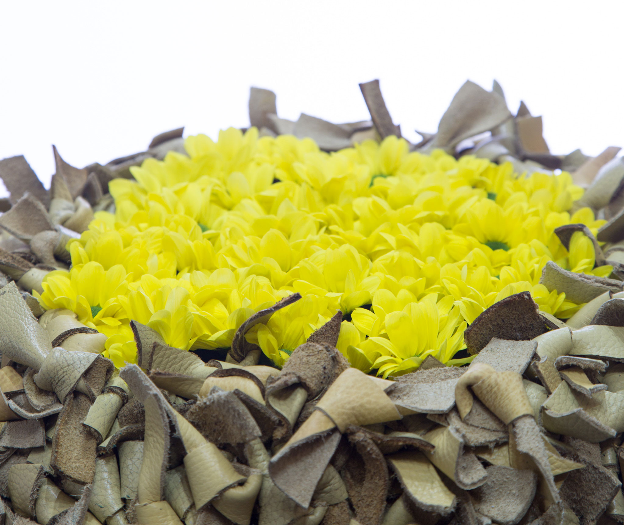 It's a nest-like shape, this bowl made out of leather knots and filled with bright yellow 'Copa' Chrysanthemums it has a wonderful spring feel to it.