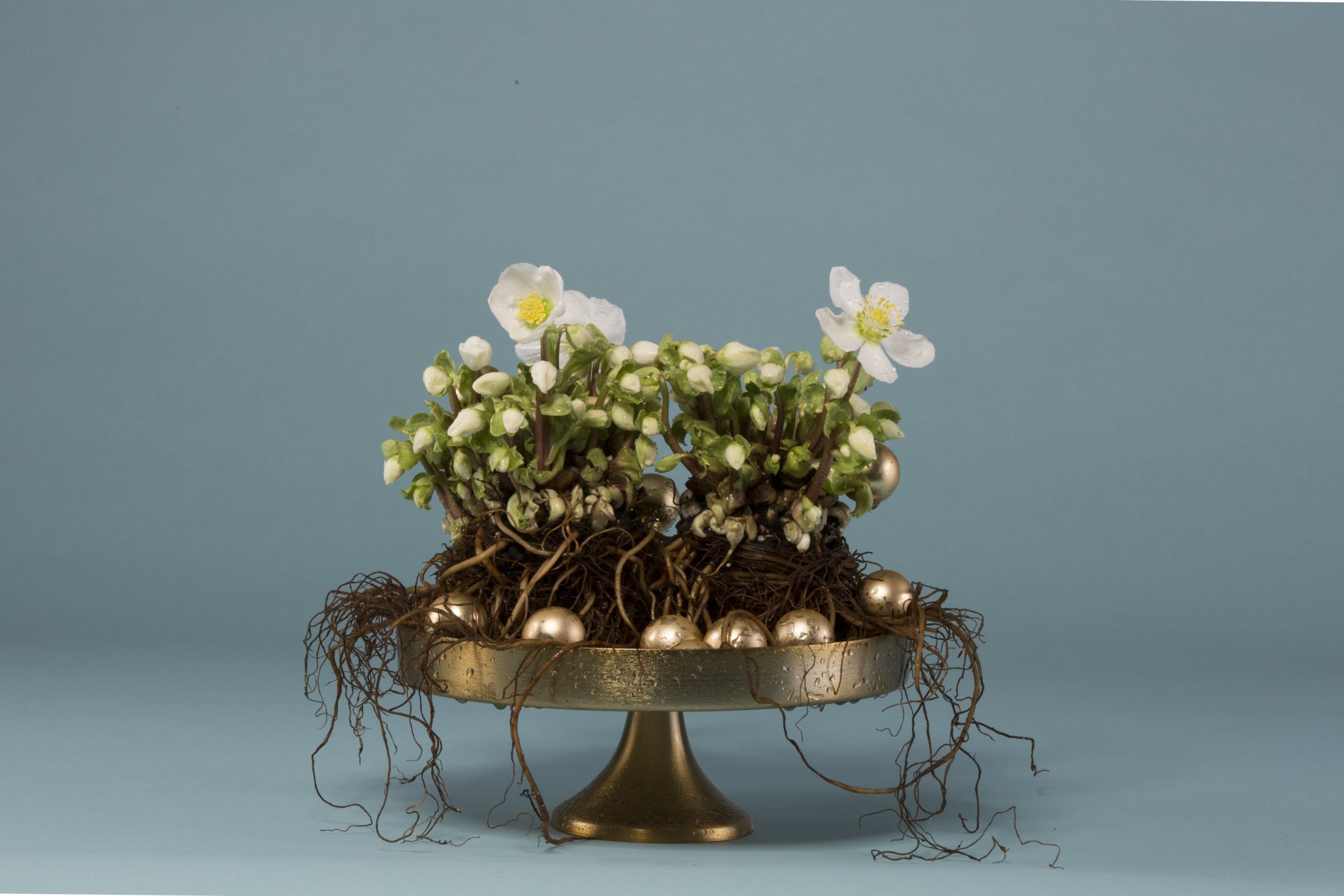 Een subtiel en chique kerstarrangement met de Helleborus 'Verboom Beauty' van Kwekerij Verboom gemaakt tijdens de 'Live Q&A' op Facebook op maandag 19 november 2018. Pim van den Akker liet hierin zien dat door de Helleborus kluit uit te wassen, je alle sterke wortels te zien krijgt. De kracht van de Helleborus kun je heel sierlijk tentoonstellen door dit op een schaal te plaatsen. Hier en daar een kerstbal ter detail en je hebt een subtiel kerstarrangement voor op tafel. Wel dagelijks de wortels besproeien met water, eens in de week een klein scheutje water in de schaal.