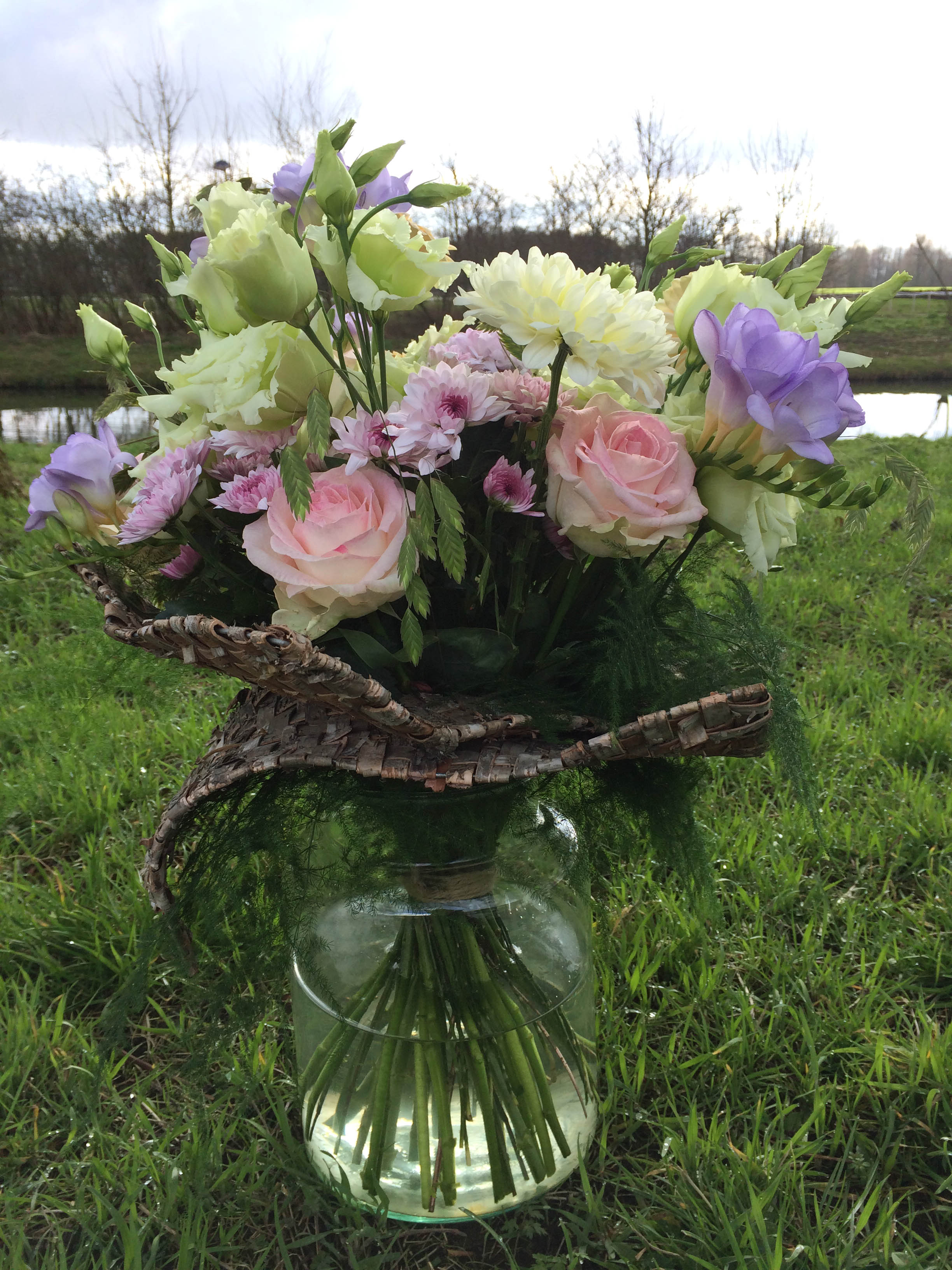 A super sweet bouquet with soft colours. Pim van den Akker used a ready made frame as a base for lisianthus, roses, gerbera daisies, freesias, chrysanthemums and grasses.