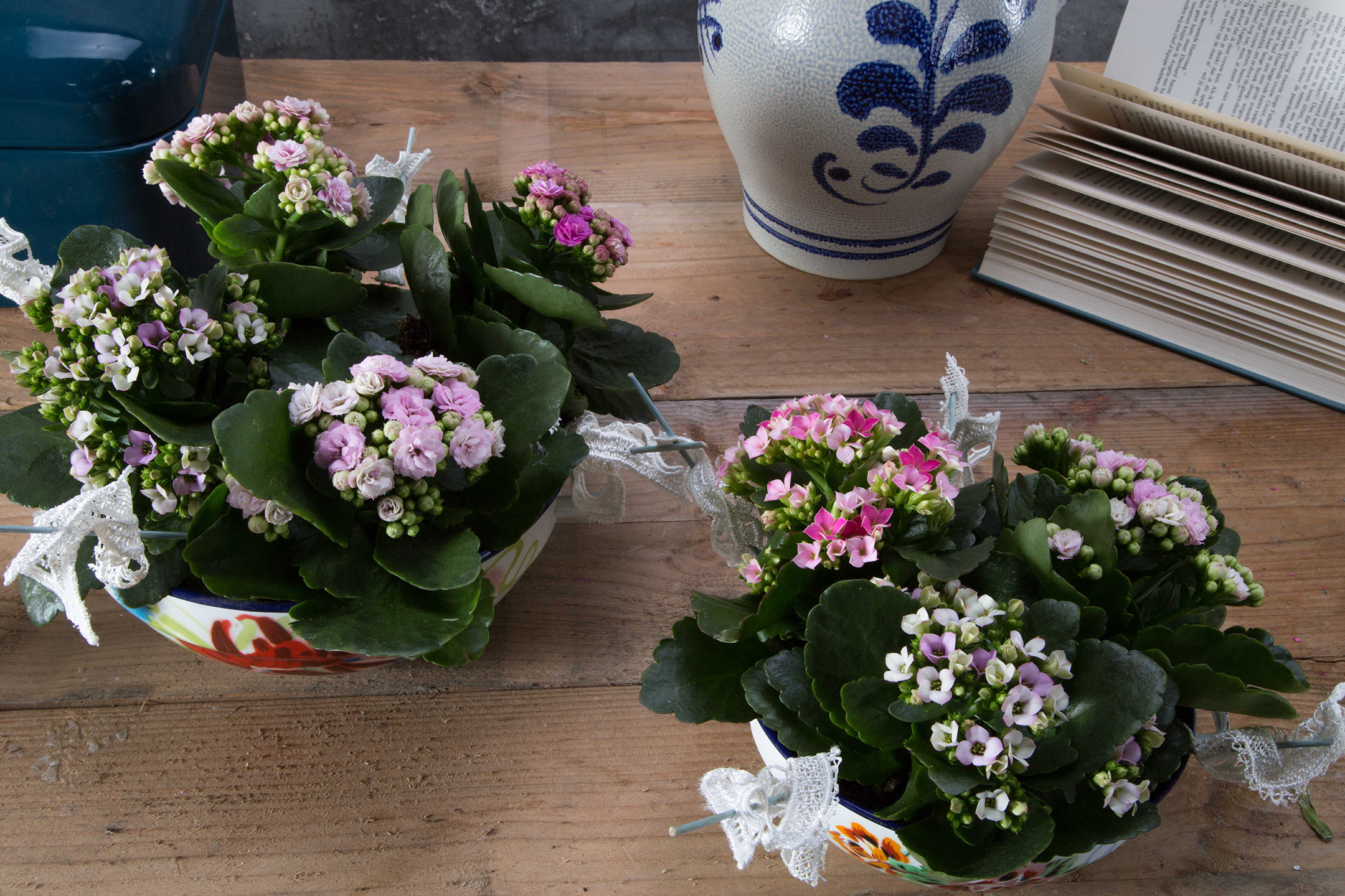 Als detail verwerkte ze stukjes kanten vitrage die mooi aansluiten bij de dubbele kalanchoë bloemetjes.