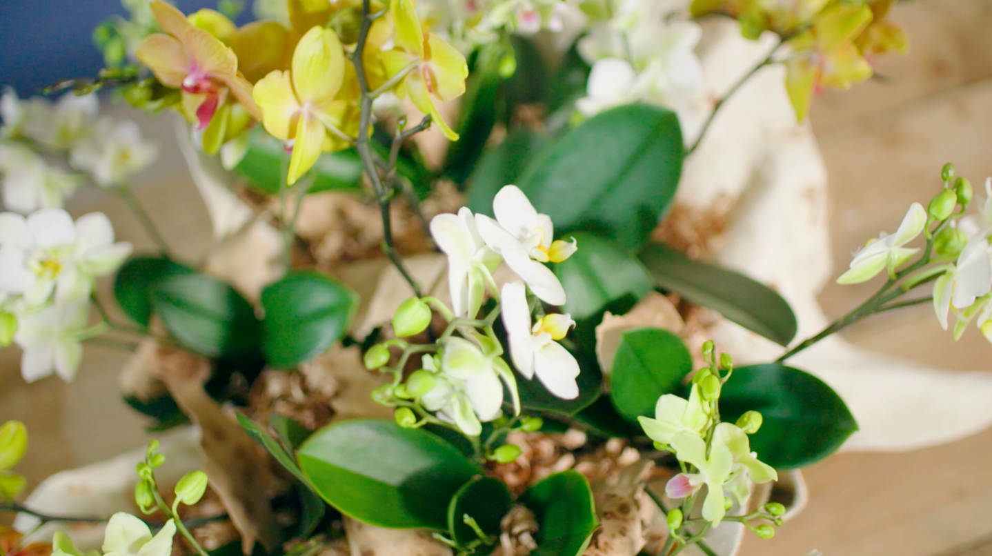 Hoe maak je een imposant tafelstuk met orchideeën? Pim van den Akker laat zien hoe je eenvoudig een uitbundig en chique stuk maakt met de Phalaenopsis 'MyMonro', 'Opti-Multi' en 'Boquetto' van Opti-flor.
