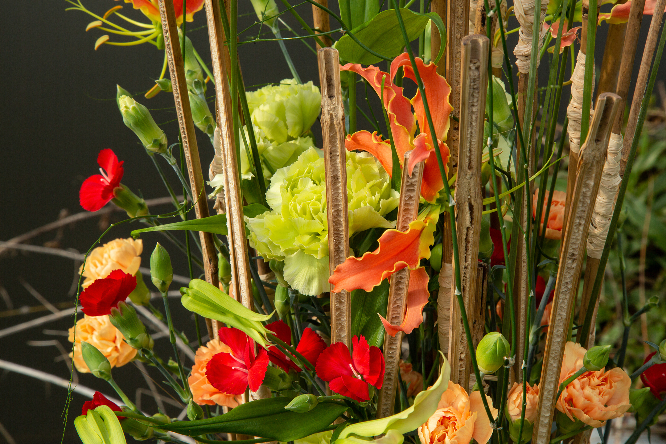 Voorbeeld van bloemwerk met bijzondere anjers in de hoofdrol! Pim van den Akker maakte in een pot van Dutz een frame van gespleten bamboestokken waartussen hij prachtige kleuren anjers en trosanjers plaatst. Eenvoudig maar effectief in een mooie mix van kleuren waardoor het bloemwerk je tegemoet straalt!