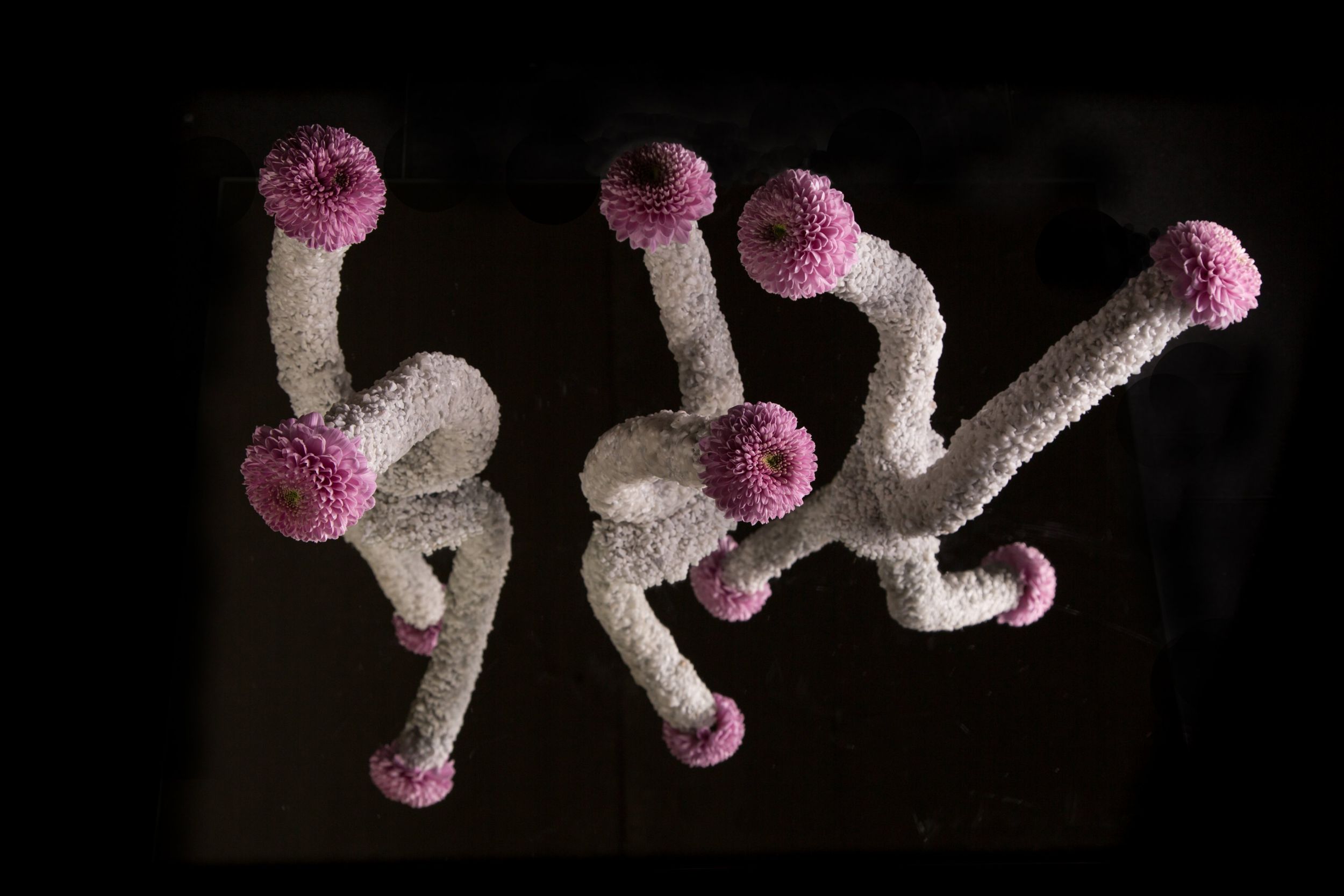 Chrysant 'Vanya Pink' is een lieflijk nieuw soort van Zentoo Chrysanthemums. Pim van den Akker maakte vrolijke vaasjes van flexibele buizen die hij bekleedde met fijn wit grind. In dit eenvoudige maar grappige design lijkt het haast of de Vanya Pink een dansje doet :)