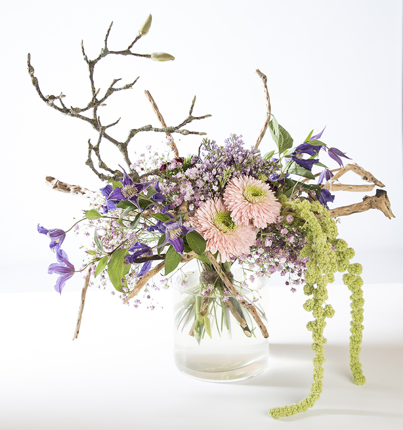 Weelderig voorjaarsboeket met Clematis, Magnoliatakken, Sering, Gipskruid, Gerbera's en Amaranthus.