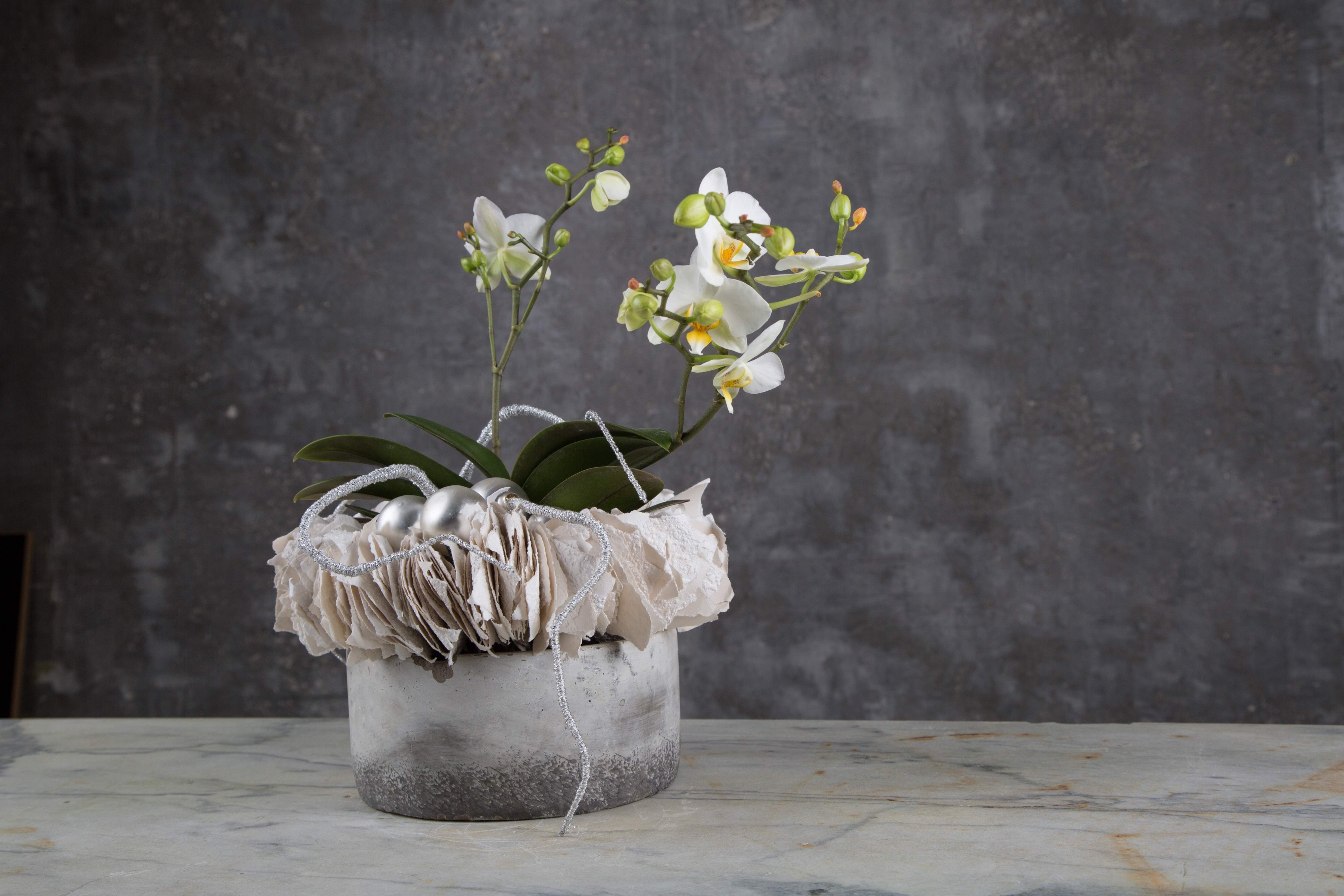 A winter design with Phalaenopsis: pieces of white wallpaper are threaded to create a collar around the orchid.