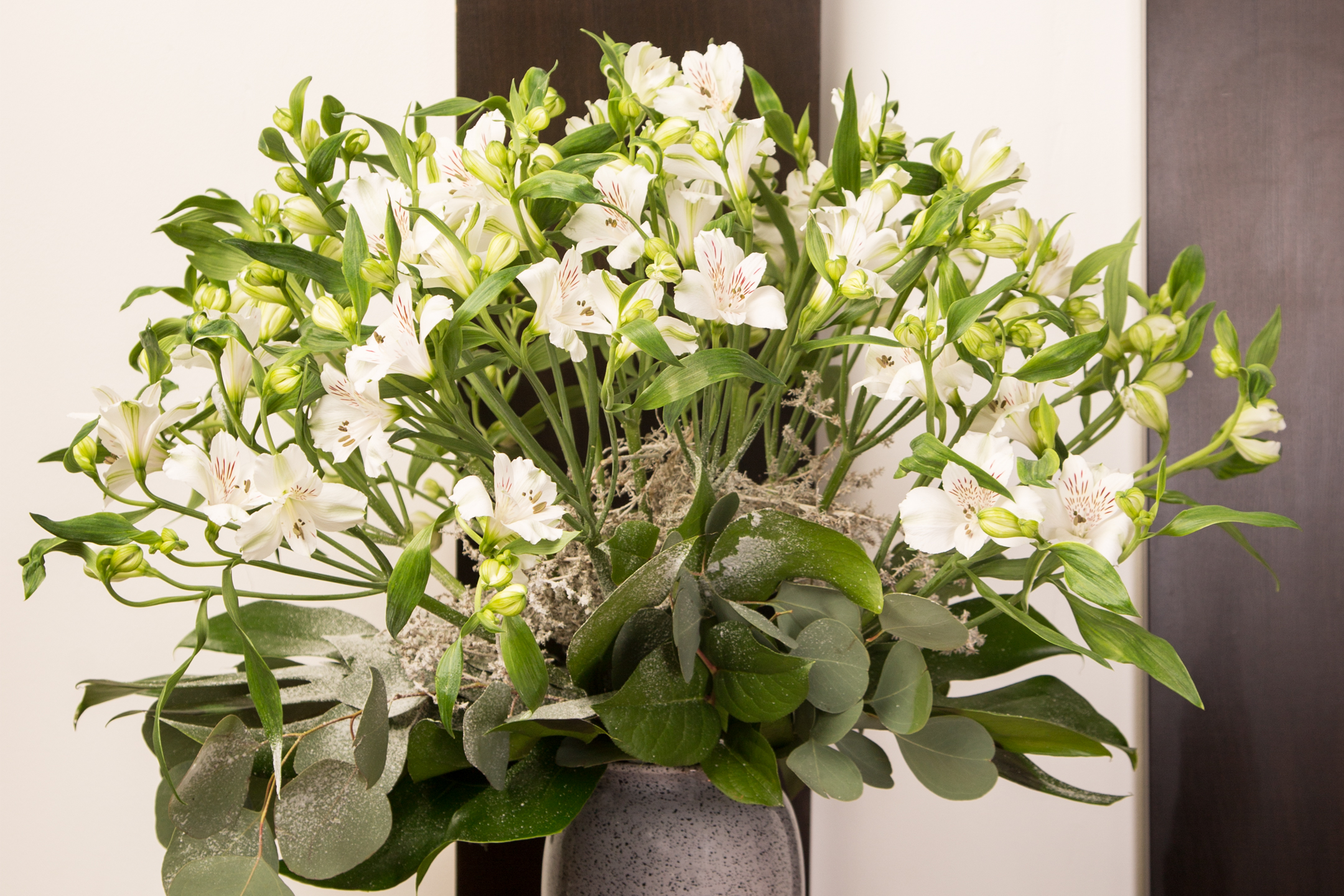 Alstroemeria's zijn jaarrond verkrijgbaar en prachtig in ieder seizoen. Zo ook in de winter, laat Pauline Brouwer van Pauline's Bloembinders zien met dit boeket. Sneeuwwitte Alstroemeria's zijn gecombineerd met eucalyptus, salal en afgewerkt met een laagje nepsneeuw. Zo'n uitbundig bloeiend boeket is precies wat je nodig hebt tijdens de donkere wintermaanden!