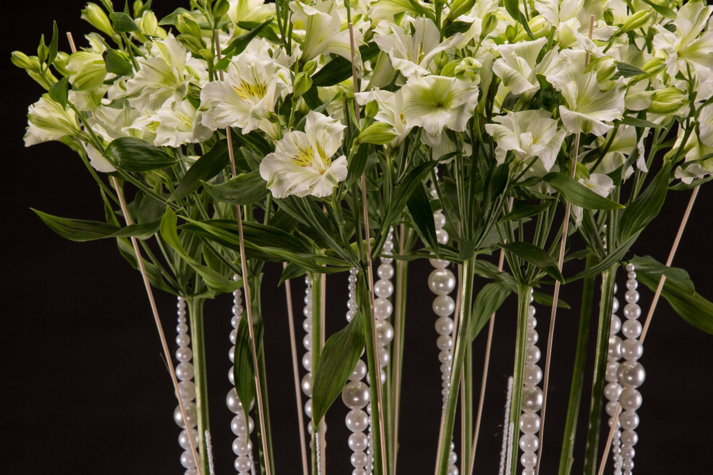 Een chique bloemwerk met prachtige witte Alstroemeria soorten. Pim van den Akker gebruikte een decoratief plafond ornament van gips en boorde daar voorzichtig gaten in zodat de stelen er doorheen gestoken kunnen worden. De parels geven het bloemwerk een feestelijke touch.