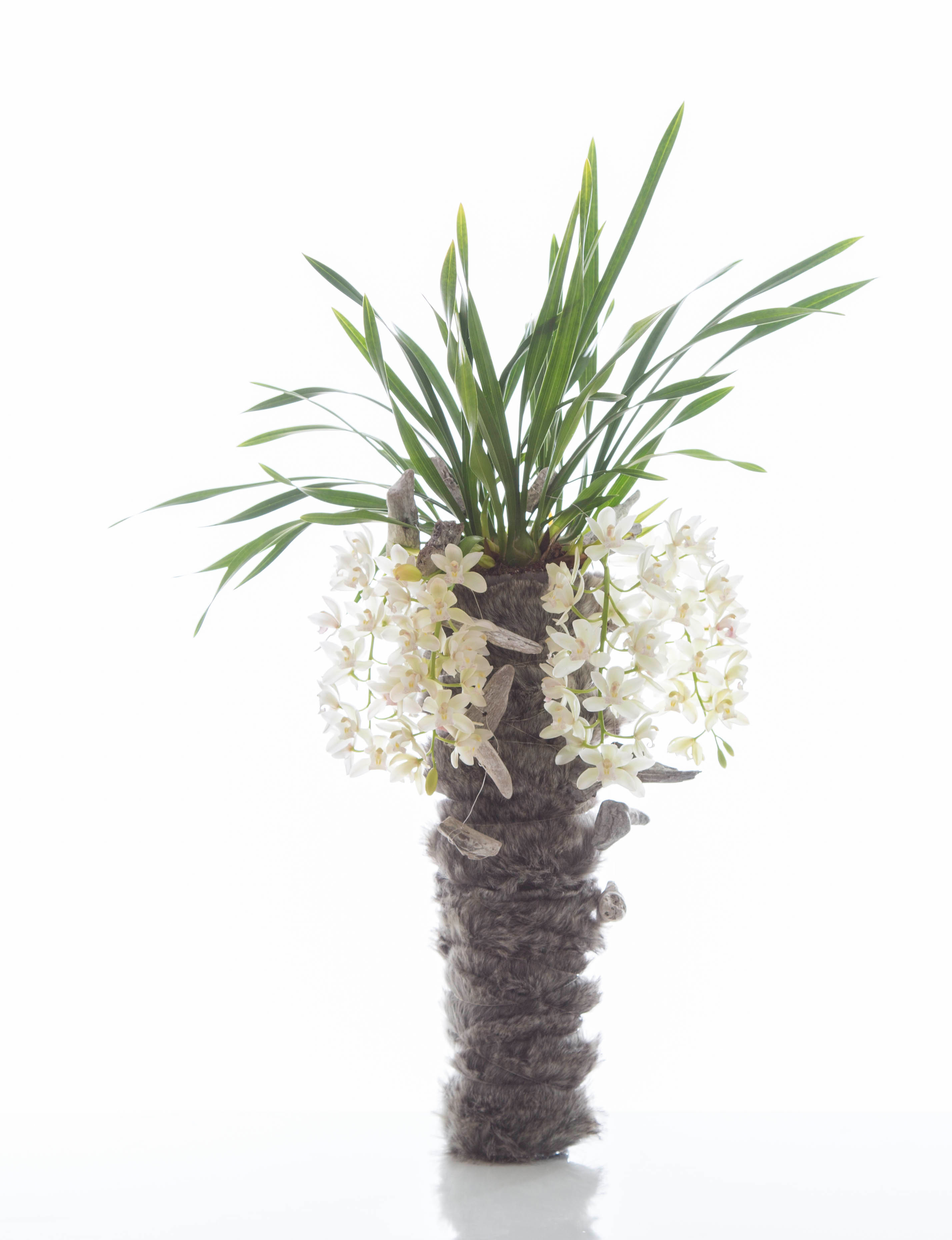 Even a natural beauty such as a Cascade Cymbidium orchid loves to dress up! Nelleke Bontje used fake fur to spice up a high container and added movement to the design with a string of drift wood pieces. A jewel for your interior and one you'll enjoy for many weeks! For caretips see our Academy page on the Cymbidium.