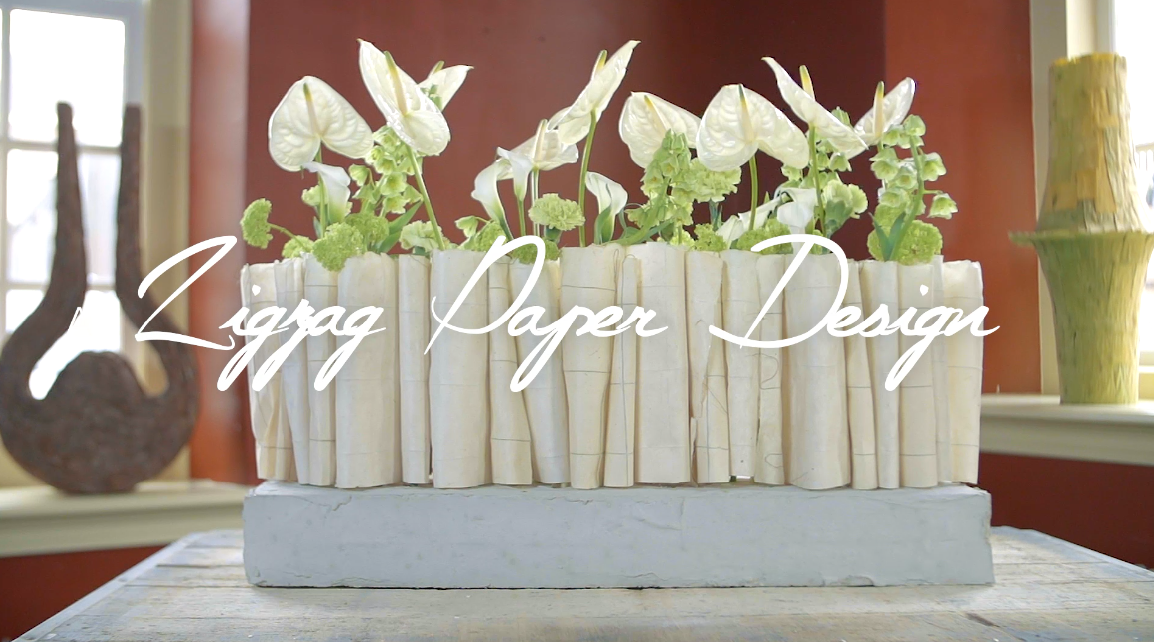 Met een basis van piepschuim en tegellijm (!), bijzonder papier en prachtige Anthuriums, Frittelaria en Viburnum creëert Geertje Stienstra een prachtig arrangement.