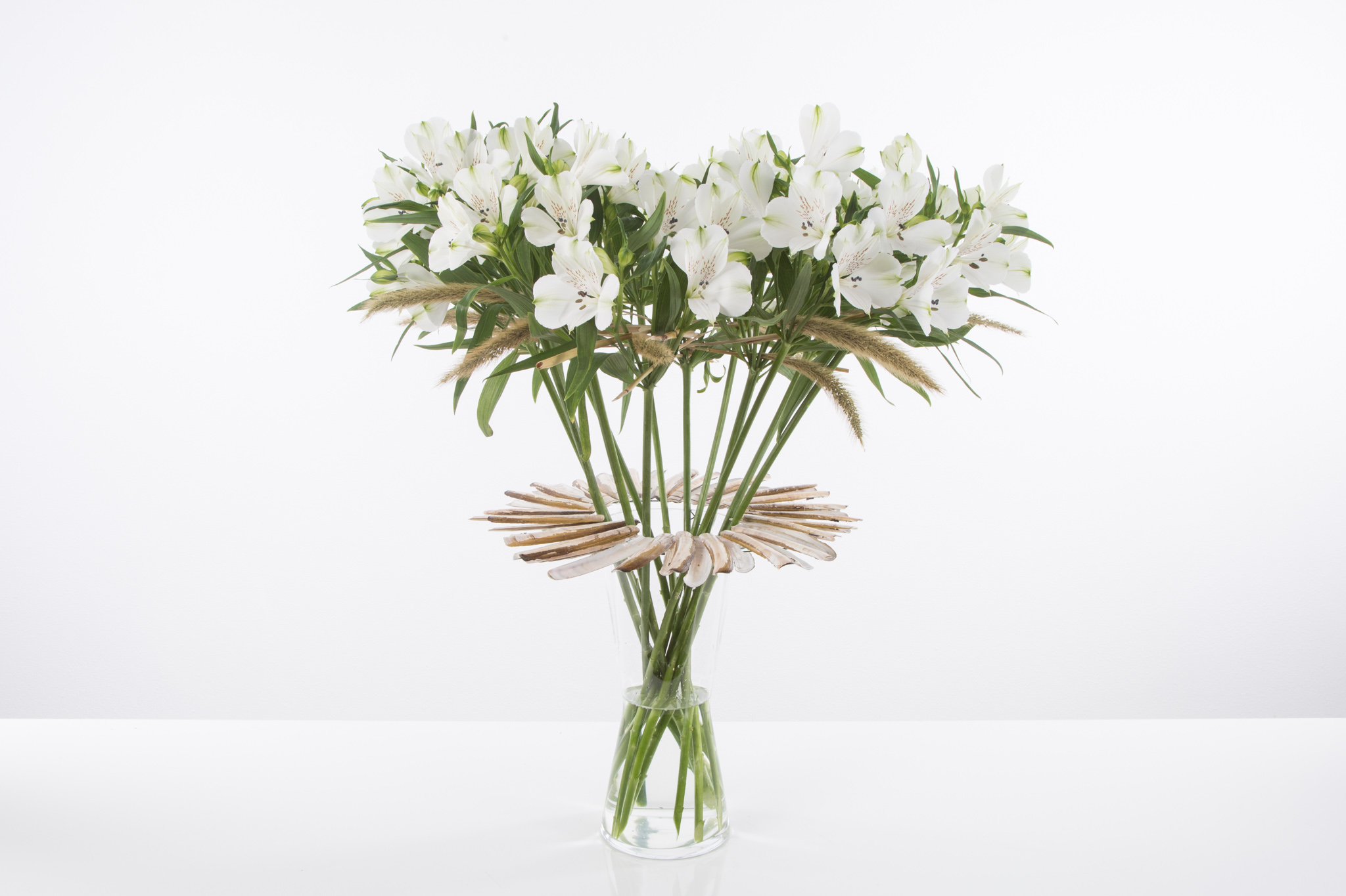 Roos van Unen heeft een fris zomers ontwerp gemaakt met de mooie witte Alstroemeria 'Frozen'. De Alstroemeria is op de korenschoof manier bij elkaar geplaatst in een vaas waarna er Pennisetum stelen her en der door de stelen van de Alstroemeria aan de bovenkant gestoken zijn. Op de rand van de transparante vaas zijn scheermes schelpen (Ensis) geplakt met hete lijm. Het ontwerp is makkelijk aan te passen naar kleinere, meer commerciële varianten. Een simpel, maar zomers ontwerp! Voel je het strandbriesje al?