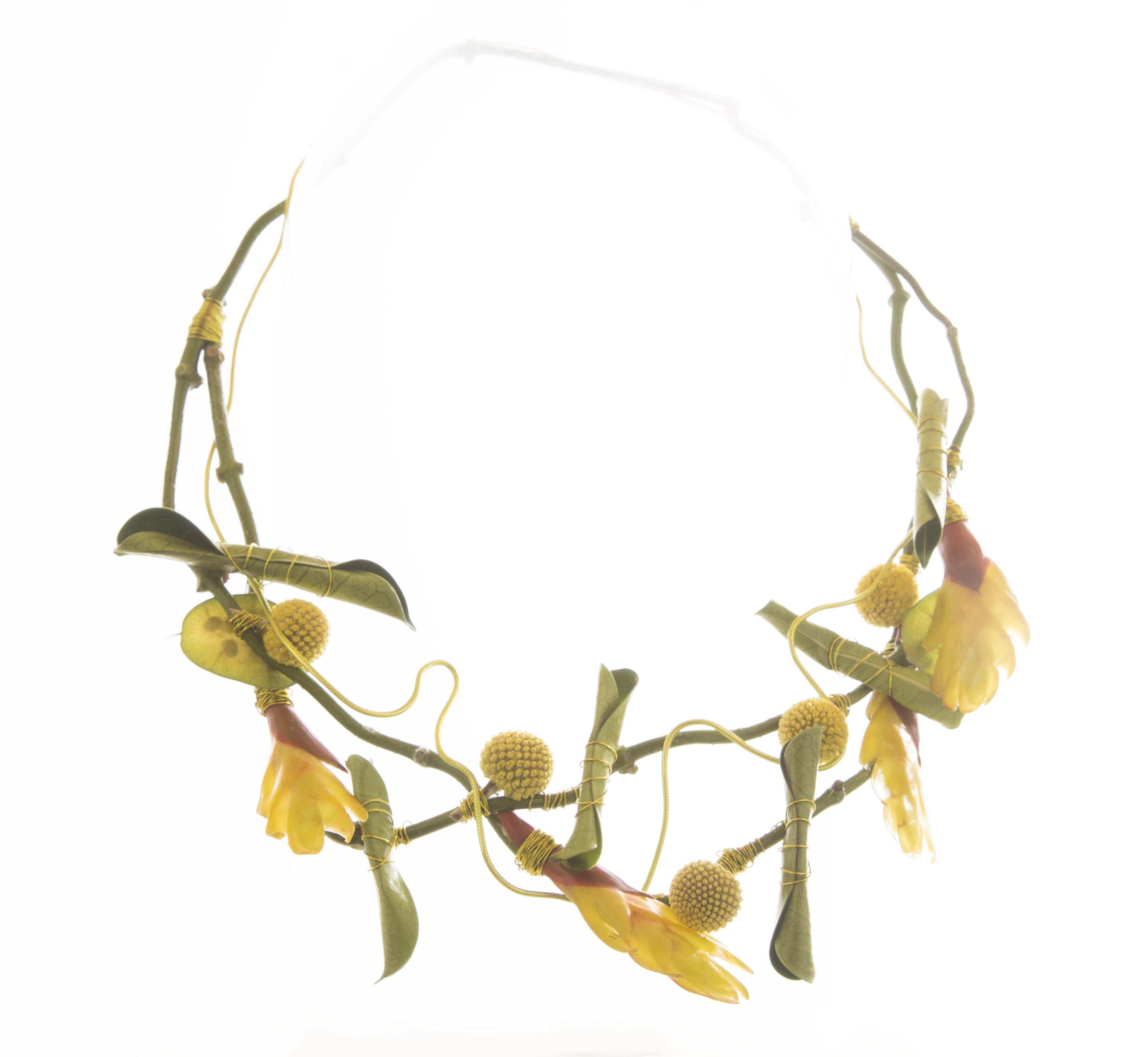 Design van Gea Korpel-Beskers waarin ze gebruikt maakt van stukjes Vriesea 'Evita' bloemen en Craspedia op een basis van Stephanotis ranken. Mooi!