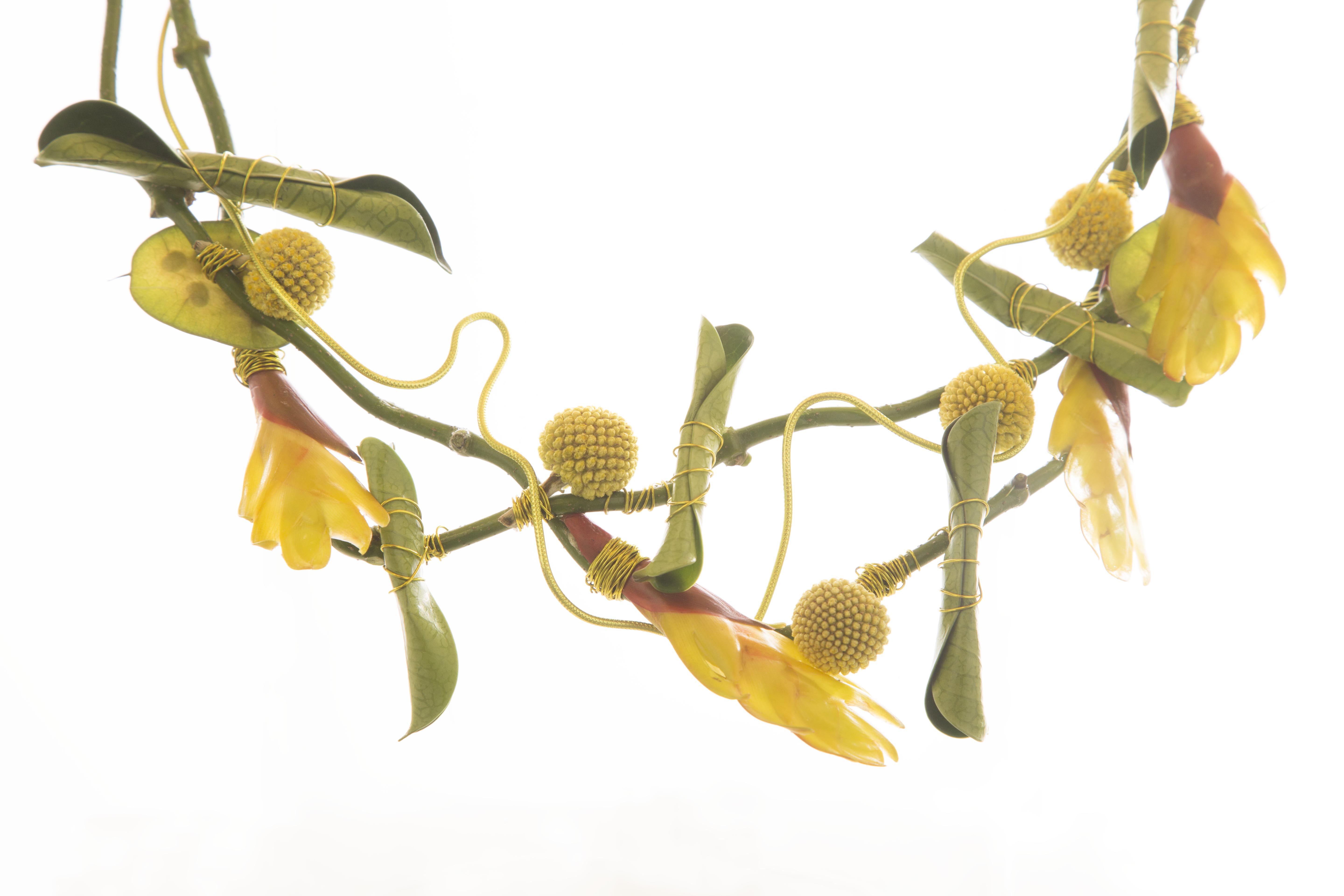 Design van Gea Korpel-Beskers waarin ze gebruikt maakt van stukjes Vriesea 'Evita' bloemen en Craspedia op een basis van Stephanotis ranken. Mooi!